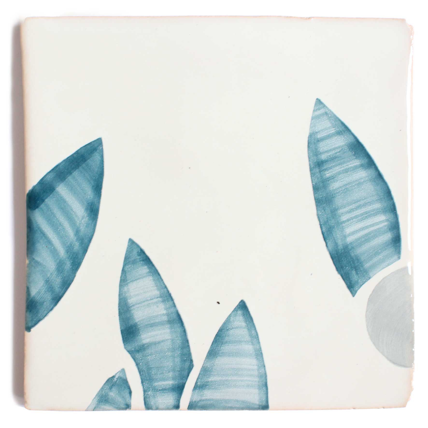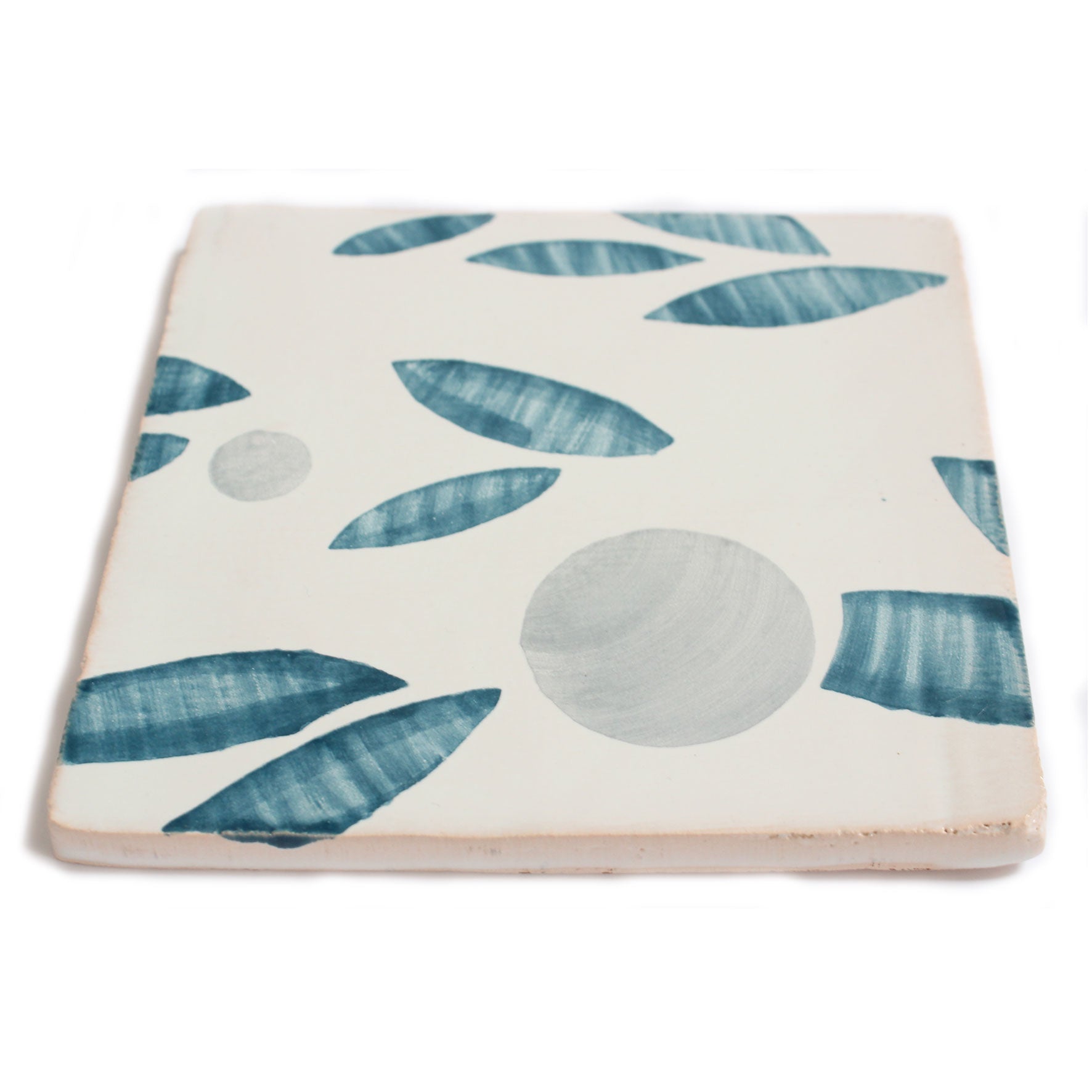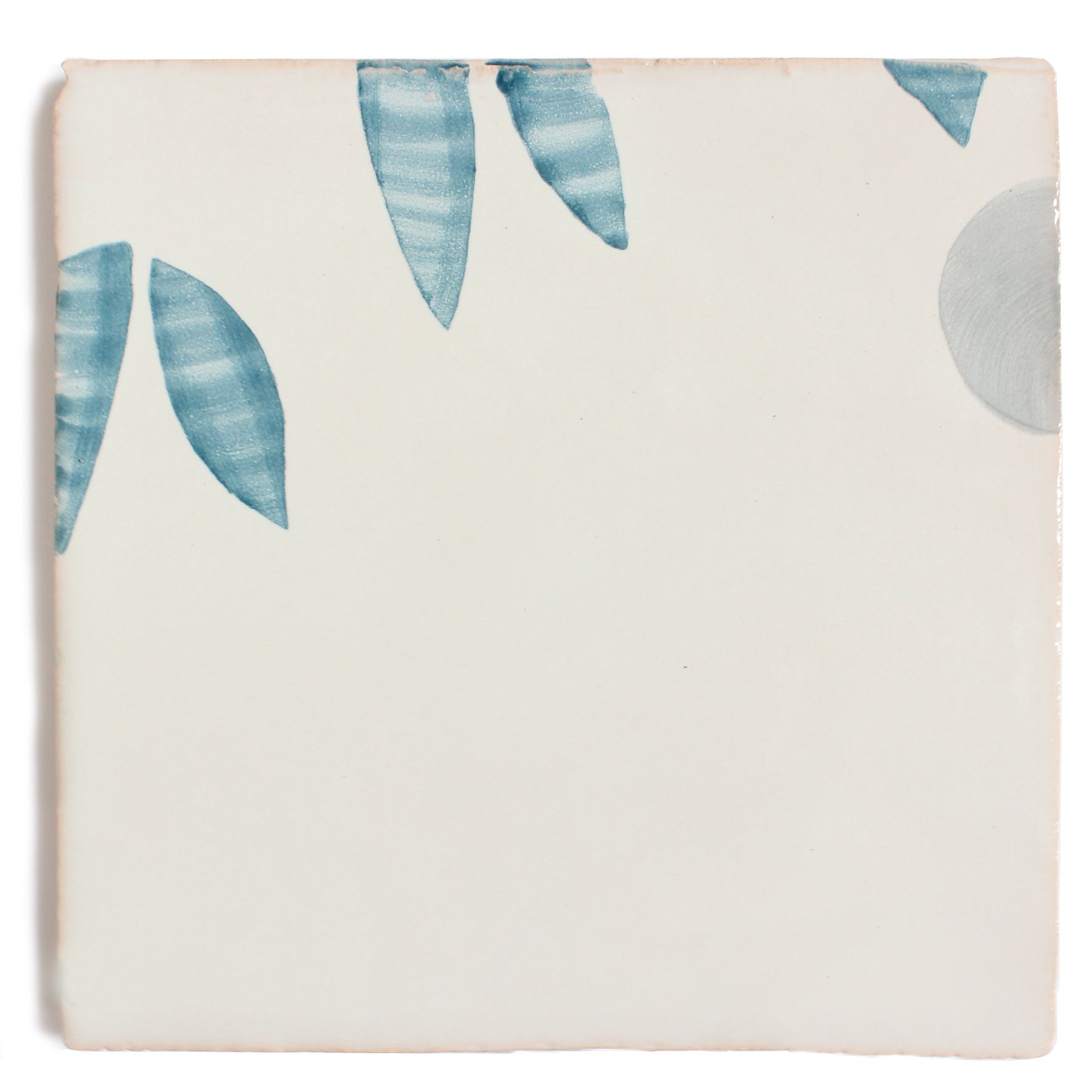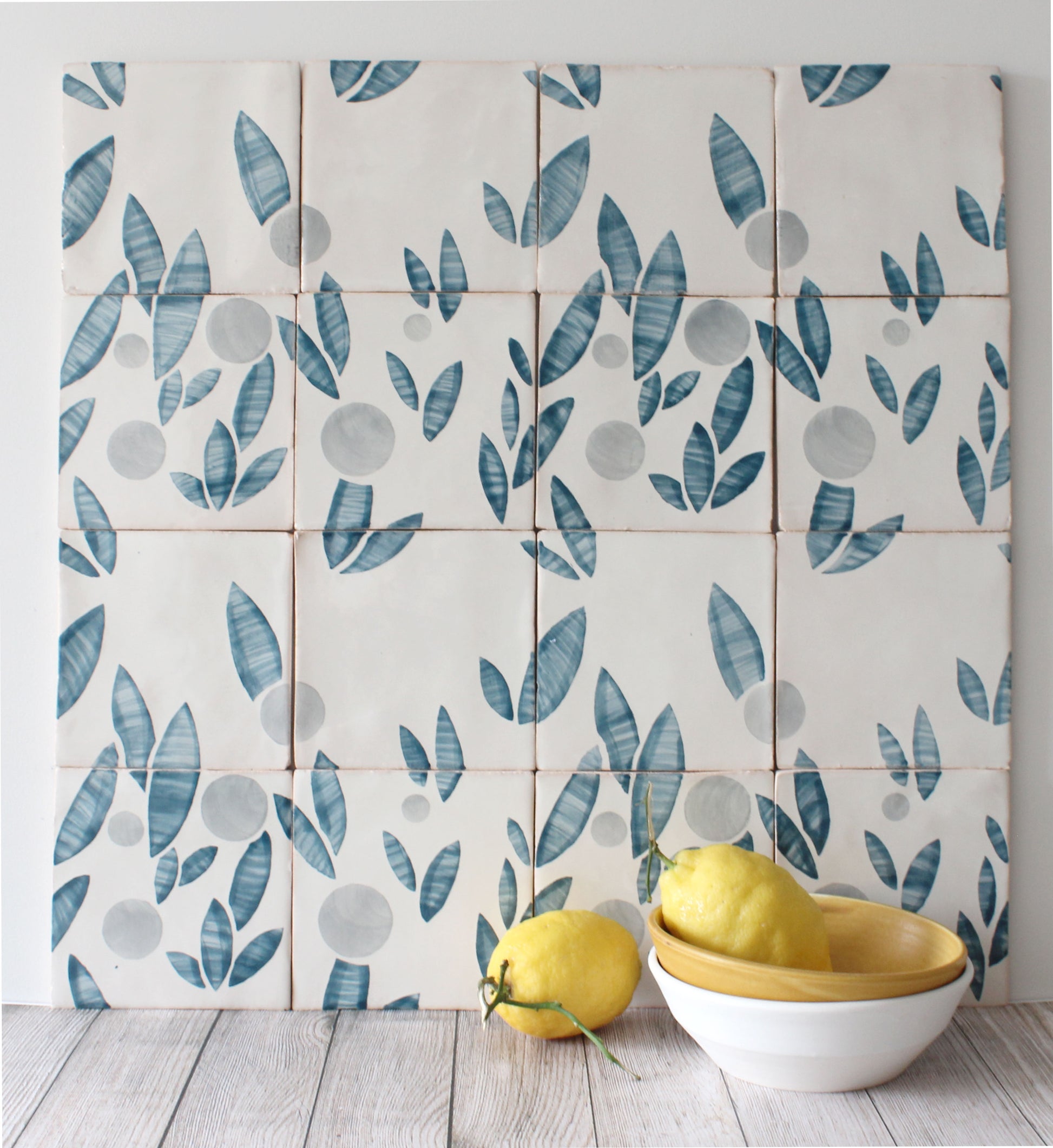 Handmade terracotta tiles hand painted with Feild’s cherry design in Blue Stone.