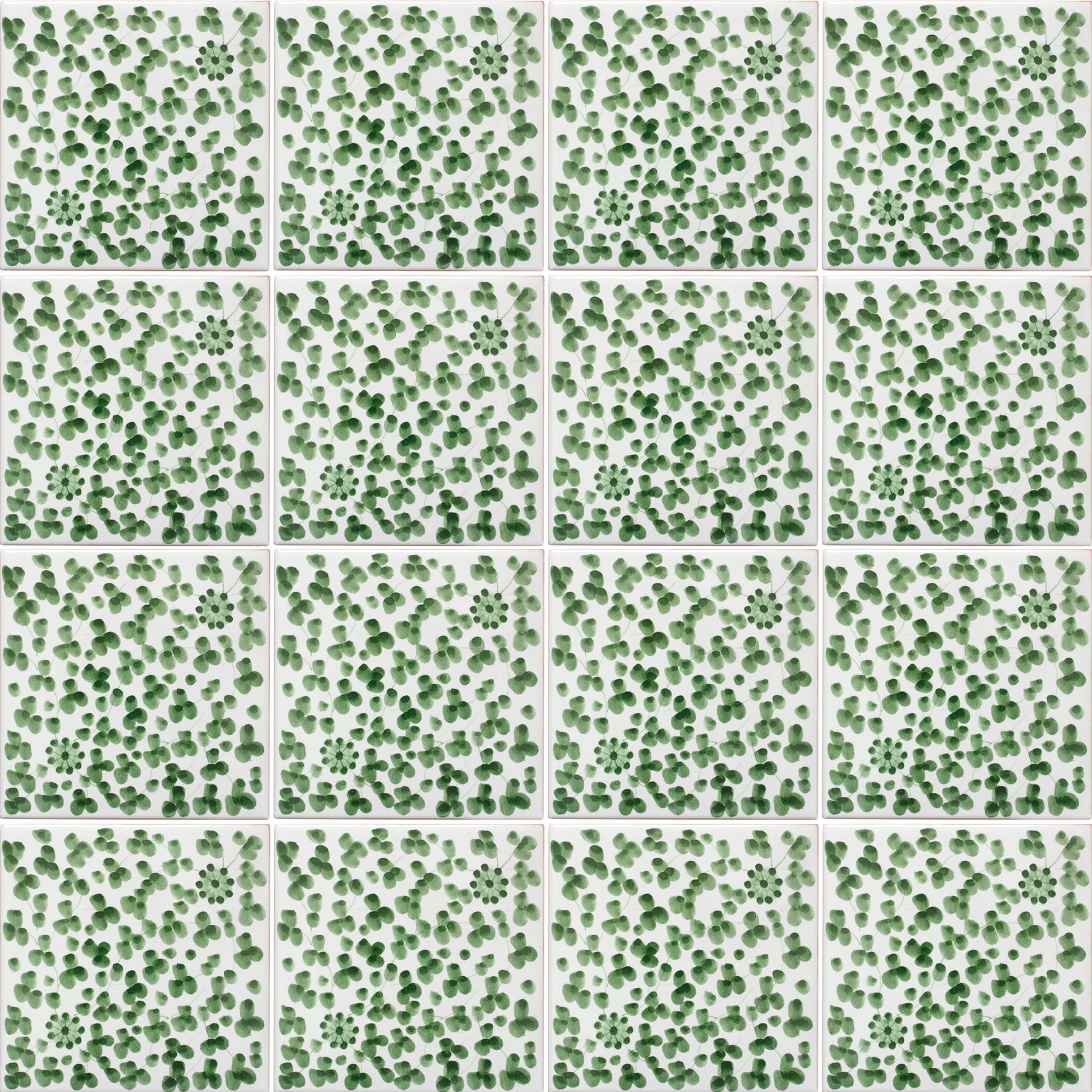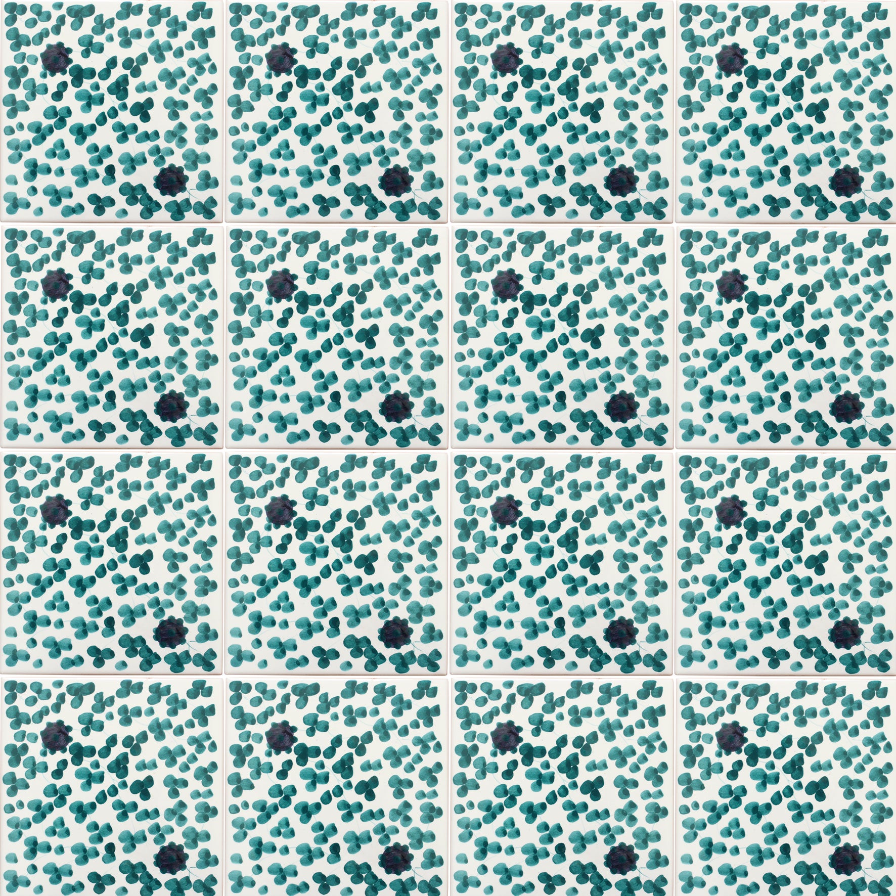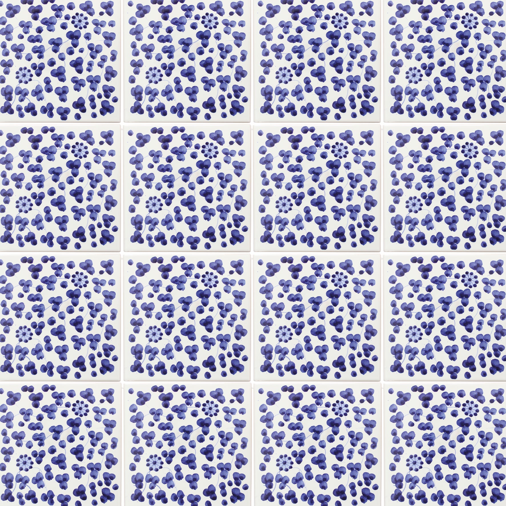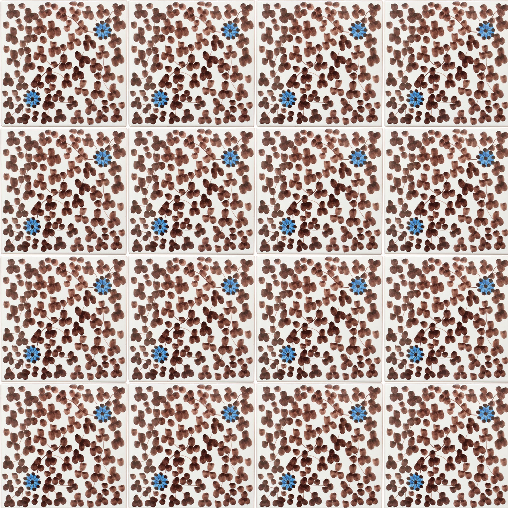 These tiles are inspired by the traditional Arabesque design from Deruta, Italy. Usually featuring birds, leaves and flowers, the design has been simplified to create a more uniform pattern. It features interwoven leaves and flowers in a calligraphy style with beautiful detailed visible brushstrokes.