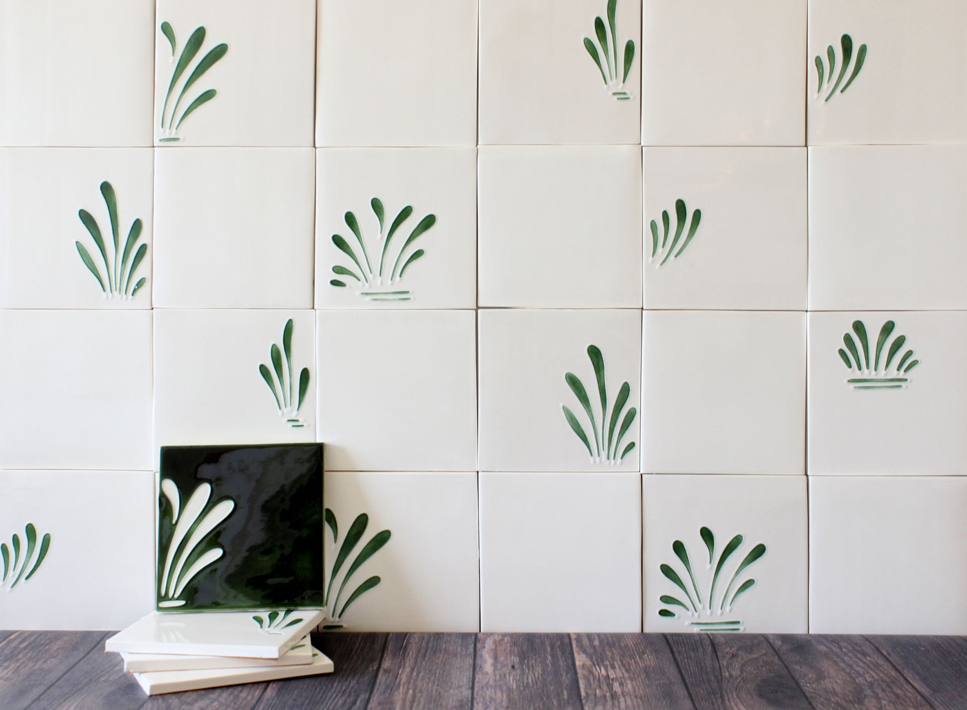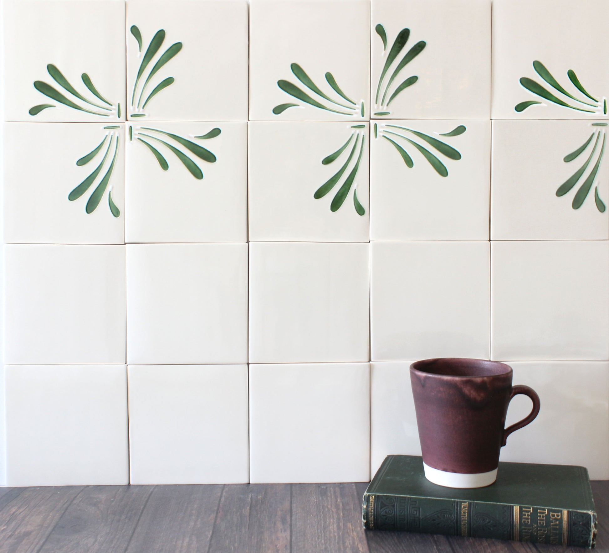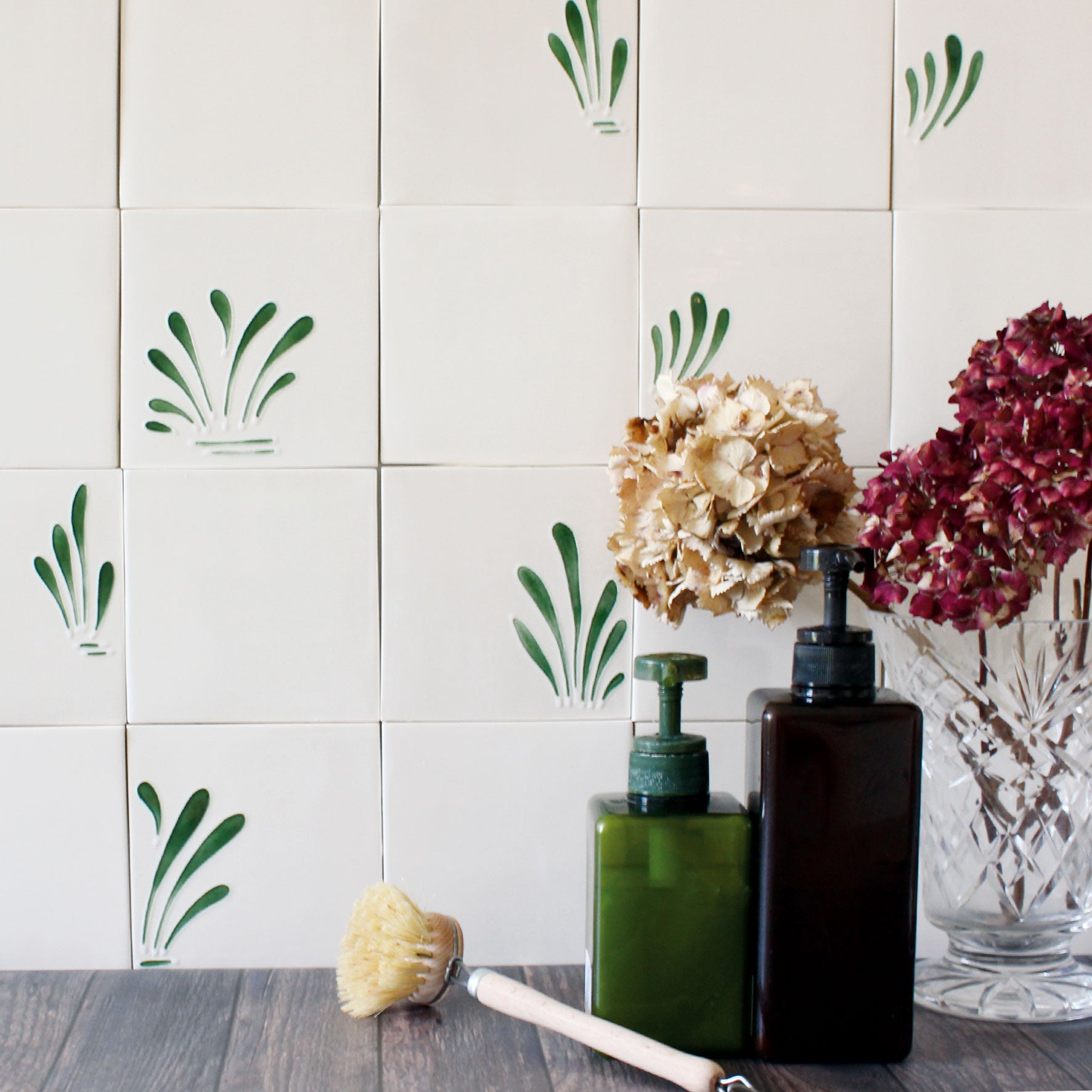 Handmade tiles hand painted with Feild’s spray design in Pine
