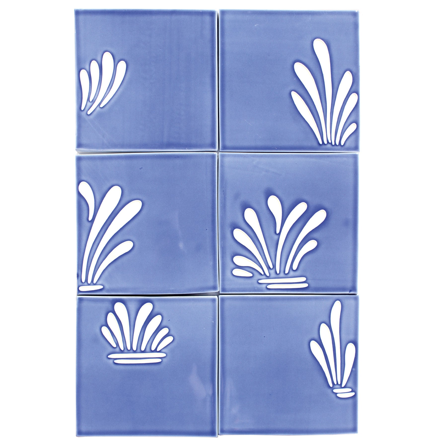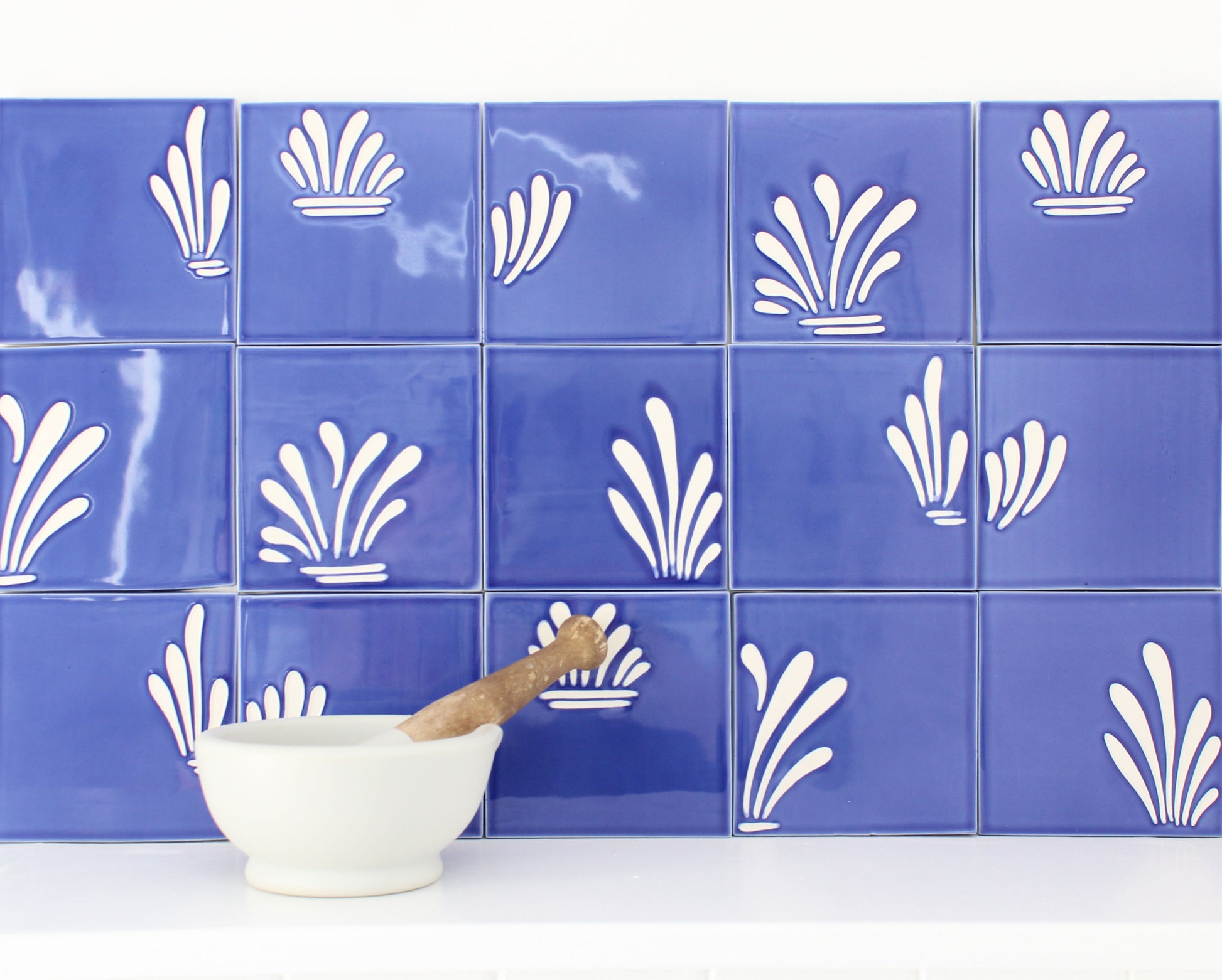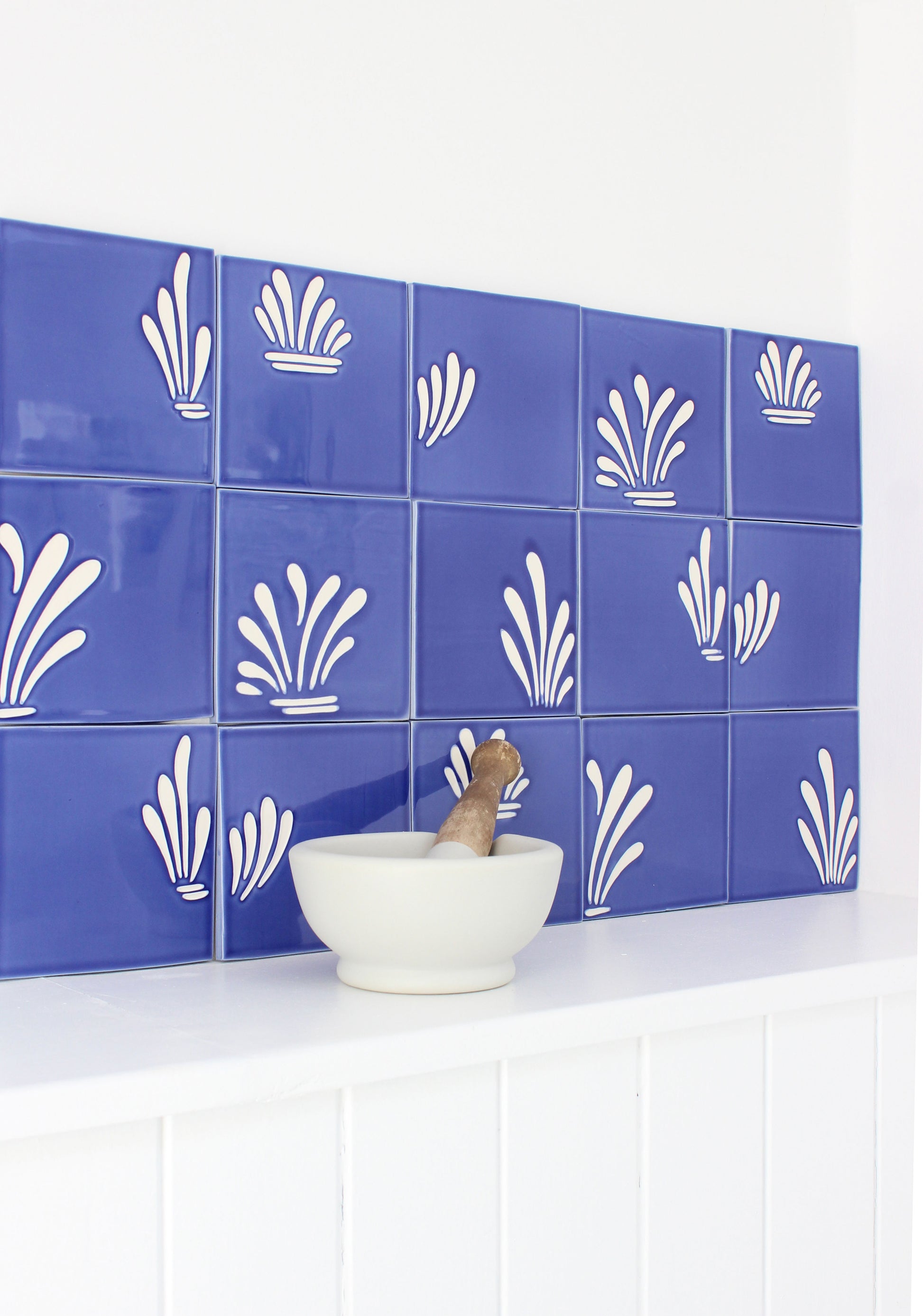 Handmade tiles hand painted with Feild’s spray design in Ocean Blue